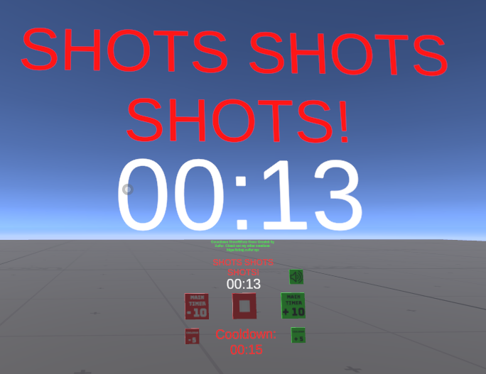 This is a simple shots timer with a programable countdown length and cooldown/shots time length. This timer also plays audio at the end of the timer and start of the next timer. The default audio is set to SHOTS SHOTS SHOTS SHOTS, for the shot timer and some normal chimes and tones for the dance timer. This simple shots timer tool is compatible with unity 2022 worlds.